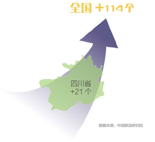近日,中国旅游研究院联合旅游社交网站蚂蜂窝发布了《2014新景区发展报告》。截止2014年9月,全国新增3A以上景区114家,四川省以21家新增景区占据榜首。中国旅游研究院院长戴斌认为,新增景区需要正视老百姓反映的各种景区问题,与资本、技术和新兴旅游创业公司等开展广泛而务实的合作,全面提升景区的形象设计、产品创新、市场营销和管理模式。